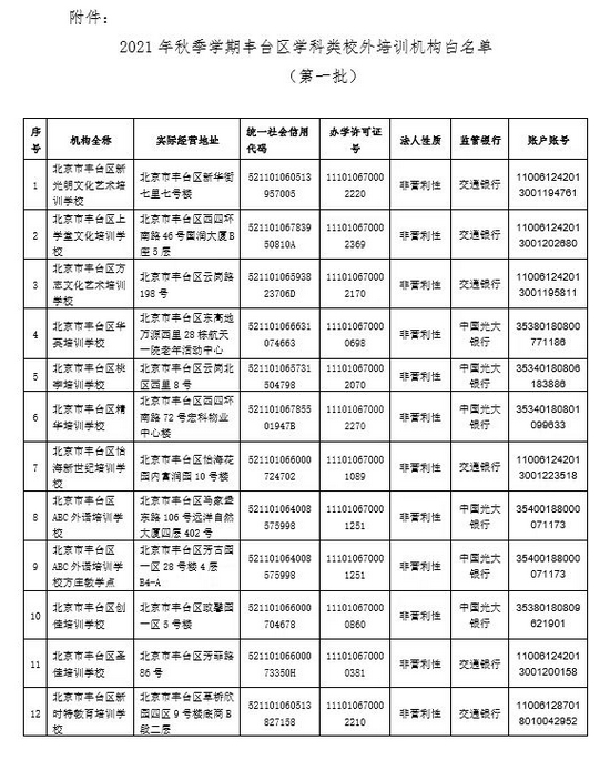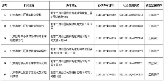 按照北京市“双减”工作要求,结合各区学科类校外培训机构实际情况,截至8月29日,北京已有房山、昌平、怀柔、大兴、通州、丰台六区公布首批学科类校外培训机构白名单,共63家机构。