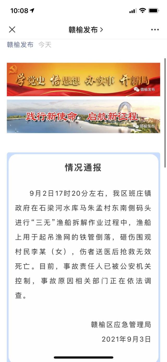 据江苏省连云港市赣榆区应急管理局9月3日 通报,9月2日17时20分左右,该区班庄镇政府在石梁河水库马朱孟村东南侧码头进行“三无”渔船拆解作业过程中,渔船上用于起吊渔网的铁管倒落,砸伤围观村民李某(女),伤者送医后抢救无效死亡。目前,事故责任人已被公安机关控制,事故原因相关部门正在依法调查。