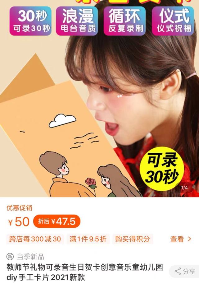 商家发布的信息显示,此类录音贺卡售价在40元左右,大约是普通纸质贺卡价格的5到8倍。“主要还是家长来买为主,尤其是一些幼儿园孩子的家长,因为孩子还不会写字,就买录音贺卡,这样也能用孩子的声音给老师传达祝福。另外也有一些中小学生甚至大学生的家长购买这种贺卡。”