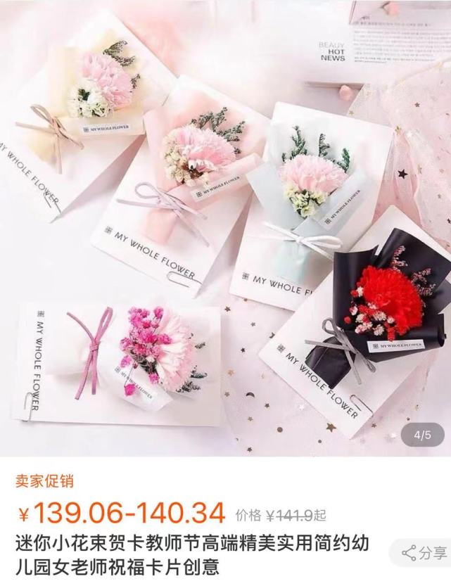 除了录音贺卡之外,还有不少商家高价售卖一款带有迷你花束的贺卡。商家介绍,整个贺卡更像一个小盒子,贺卡封面上会放一束干燥花束,花束和贺卡一起存放在盒子中。此外,商家还会附赠一串小彩灯,“把彩灯放在盒子里,老师打开盒子就可以看到彩灯把整束花照亮的景象,非常好看。”这样带有花束、彩灯多重功能的贺卡,在网络商城上售价从70元到100多元不等。一名自称是学生家长的买家在商品页面评论称,自己是为教师节给老师送礼物购买了这款贺卡,感觉此类贺卡比普通贺卡更有创意。