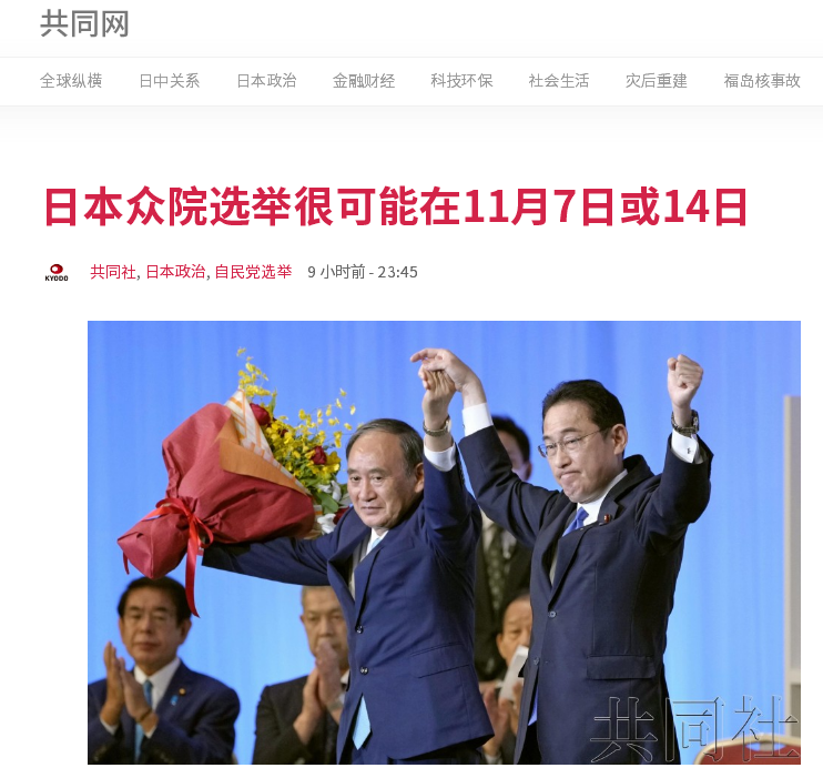日本自民党新总裁岸田文雄将在召集临时国会的10月4日被指名为首相,很可能最快中旬解散众院。共同社29日报道分析称,众院选举在“10月26日发布公告、11月7日投计票”或者“11月2日发布公告、14日投计票”被视为热门方案。众议员任期在10月21日届满,任期结束后举行大选是现行《宪法》下首次。