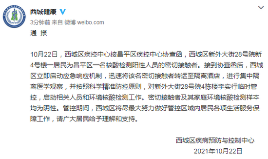 10月22日,西城区疾控中心接昌平区疾控中心协查函,西城区新外大街28号院新4号楼一居民为昌平区一名核酸检测阳性人员的密切接触者。接到协查函后,西城区立即启动应急响应机制,迅速将该名密切接触者转运至隔离酒店,进行集中隔离医学观察,并按照科学精准防控原则,对新外大街28号院4栋楼宇实行临时管控,启动相关人员和环境核酸检测工作。密切接触者及其家庭环境核酸检测样本均为阴性。管控期间,西城区将尽最大努力做好管控区域内居民各项生活服务保障工作,请广大居民给予理解和支持。