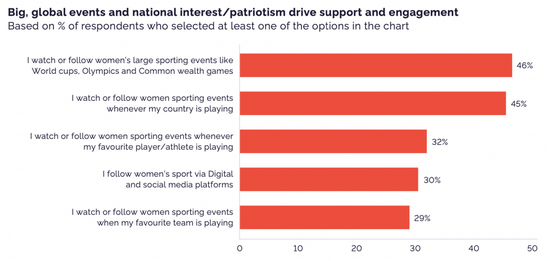 根据YouGov的报告,大型国际赛事的举行,依旧是推动人们关注并参与女性体育的主要因素。