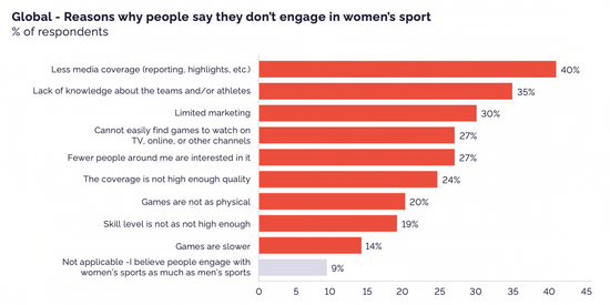 在调查中,40%的受访者认为,相对于薪酬、商业赞助和政策等方面的因素,媒体对于女子体育的主动关注度不足,仍是导致女子体育不受关注的最主要体现。毕竟,下降的社会关注度,反过来又会对媒体关注度造成负面效果,造成恶性循环。