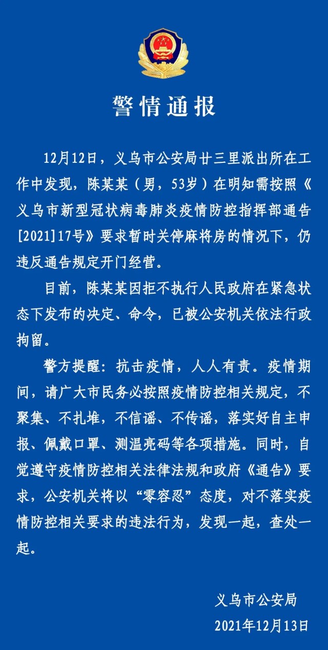 12月12日,义乌市公安局廿三里派出所在工作中发现,陈某某(男,53岁)在明知需按照《义乌市新型冠状病毒肺炎疫情防控指挥部通告[2021]17号》要求暂时关停麻将房的情况下,仍违反通告规定开门经营。目前,陈某某因拒不执行人民政府在紧急状态下发布的决定、命令,已被公安机关依法行政拘留。