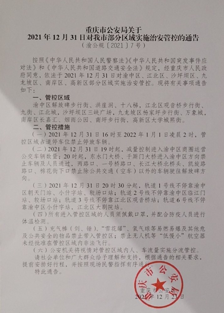 《通告》显示,2021年12月31日,将对渝中区解放碑步行街、洪崖洞、十八梯,江北区观音桥步行街九街、江北城,沙坪坝区三峡广场,九龙坡区杨家坪步行街、万象城,南岸区长嘉汇、烟雨公园、南坪步行街,高新区大学城熙街实施治安管控。