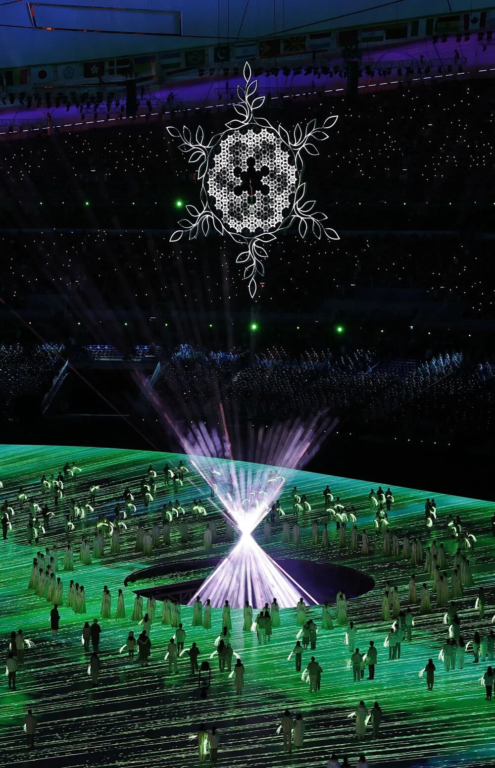 主火炬熄灭的瞬间,我的心中百感交集。我们重现了2008年的那一幕:星星在地面汇聚,成为星光五环,伴随着《我和你》主题曲缓缓升起。然后这朵雪花火炬再缓缓下降,两者在空中交错,很浪漫,好像时光倒流一样,我自己觉得这应该是一个经典瞬间。