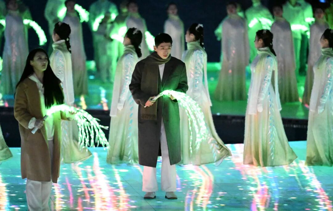 所以我们选择了“折柳送别”的意象。大家拿着一个发光的“柳条”,在《送别》的音乐中缓缓地向中间走,有无数道绿色的光像纪念碑一样升起来。我们特别把光调成绿色的,意味着生命、希望和成长,我们没有太多的悲伤,更多的是一种深沉的纪念。