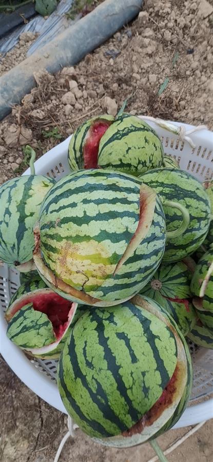 “我们家的西瓜都是销往浙江、上海等地,老早就已经有客户预定了,这个星期就可以卖出去了,哪知道出这个事。”何女士告诉极目新闻记者,21日晚,她家的工人从地里回来后,就告诉她丈夫地里的好多西瓜都裂了。第二天一早她和丈夫便前往瓜地巡查,发现18个大棚里的西瓜都裂开了。“一开始我们还以为是西瓜熟透了,仔细检查才发现几乎每个西瓜上都有洞孔,像是被螺丝刀扎的,不少瓜已经开始腐烂了。”
