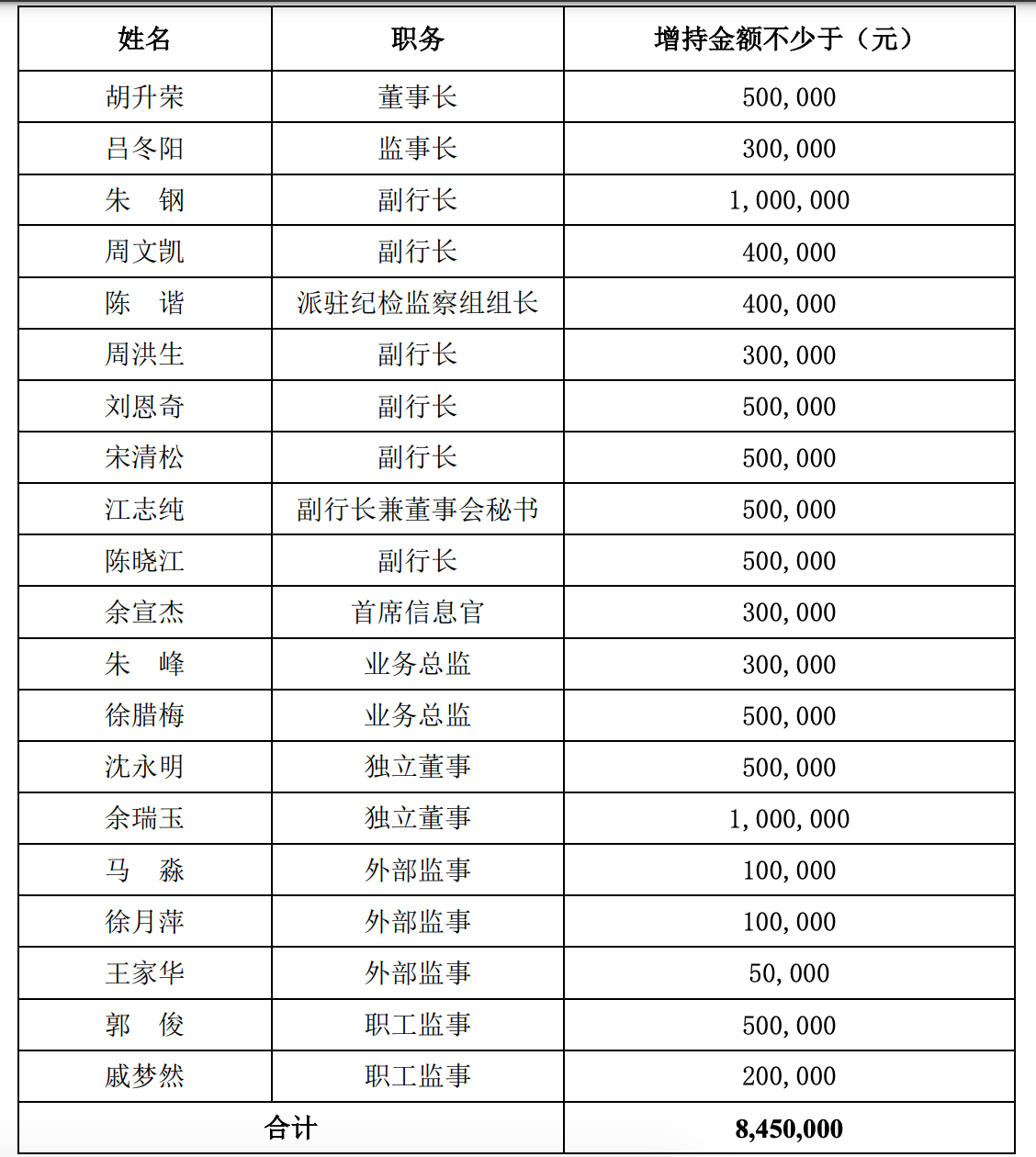 具体来看,该行董事长胡升荣拟增持金额不少于50万元,朱钢、周文凯、周洪生3名副行长拟增持金额分别不少于100万元、40万元、30万元,刘恩奇、宋清松、江志纯、陈晓江4名副行长拟增持金额均不少于50万元。
