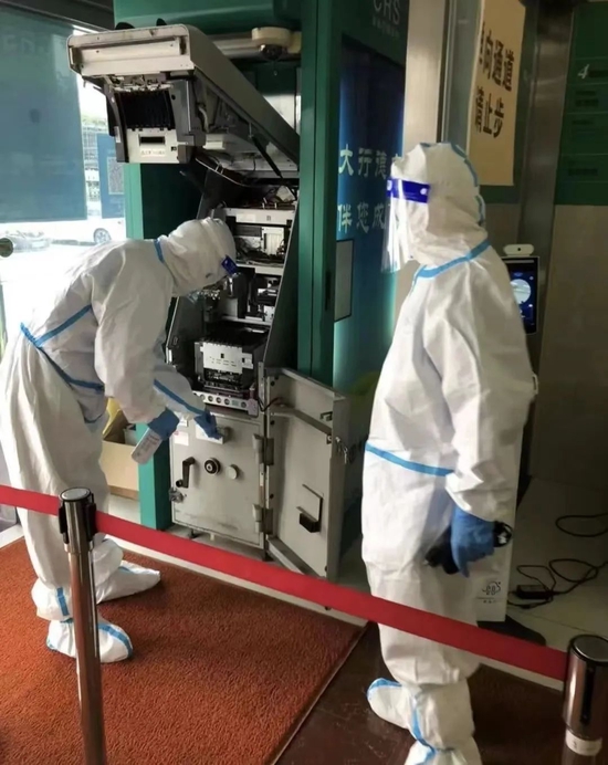 银行工作人员为现金自助机具加钞、消毒