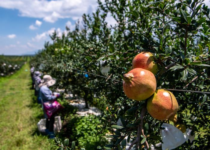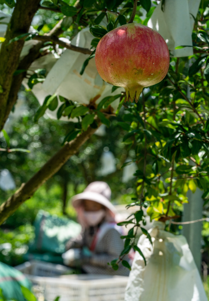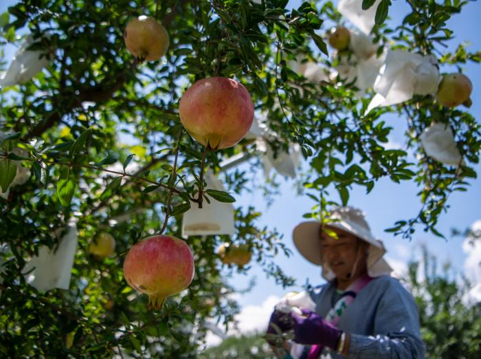 果农在云南蒙自市草坝镇的五八农业软籽石榴种植基地采摘石榴(8月9日摄)。 蒙自市草坝镇的五八农业软籽石榴种植基地采用水肥一体化智能灌溉的现代化模式,可在有效控制树高提高产量的同时高效节约水肥。