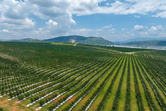 这是位于云南蒙自市草坝镇的五八农业软籽石榴种植基地(8月9日摄,无人机照片)。 近日,云南省红河哈尼族彝族自治州蒙自市草坝镇五八农业软籽石榴种植基地的2300亩软籽石榴获得丰收并陆续上市销售。