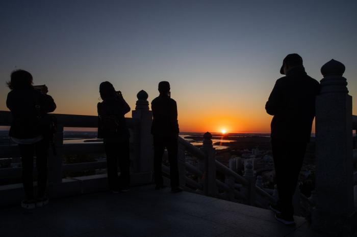 9月4日,游客在抚远市“东极阁”看日出。起早登上“东极阁”看日出东方、探秘野熊园感受人与自然和谐、深入赫哲族村寨感受民族风情……随着“观日游”“民俗游”“鱼文化游”等特色文旅品牌日趋成熟,抚远市正迎来全域旅游大发展。