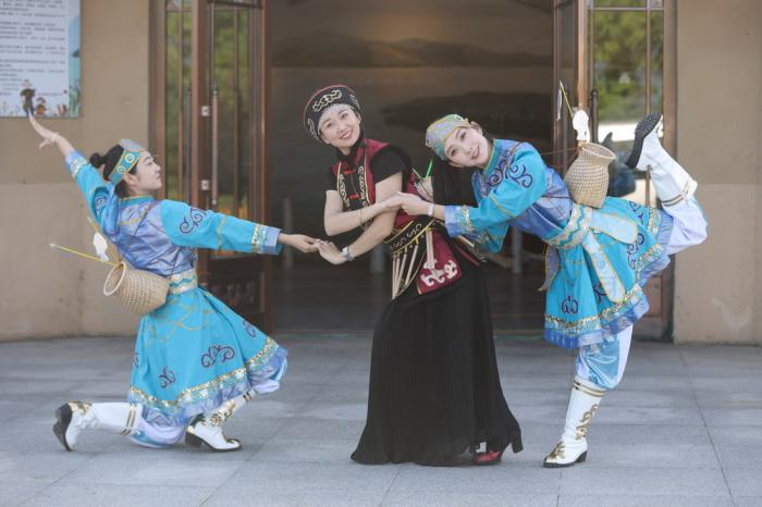 9月4日,工作人员在赫哲民俗展示馆前表演赫哲族舞蹈。 今年夏季,不少游客来到素有“华夏东极”之称的抚远市。在乌苏镇抓吉赫哲族村,潘秀红经营多年的“抓吉赫哲鱼馆”常是宾客满座。