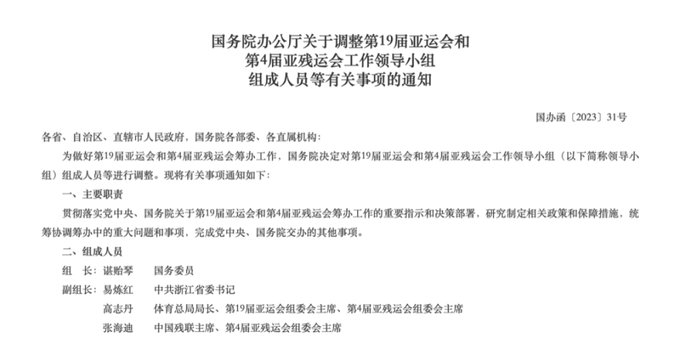 今年4月,国办发布了调整该领导小组组成人员的通知。调整之后,领导小组组长由国务委员谌贻琴担任。副组长有3人,包括浙江省委书记易炼红、体育总局局长高志丹和中国残联主席张海迪。
