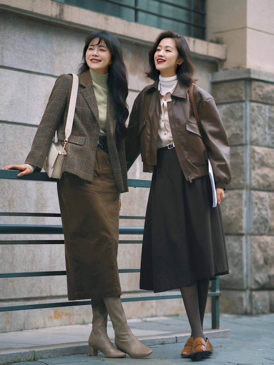 棕色系的皮衣外套,搭配高腰的半身裙,有一种复古港风的美。内搭上可以更加简约别致一些,小高领打底衫配印染衬衫,也是时髦洋气。
