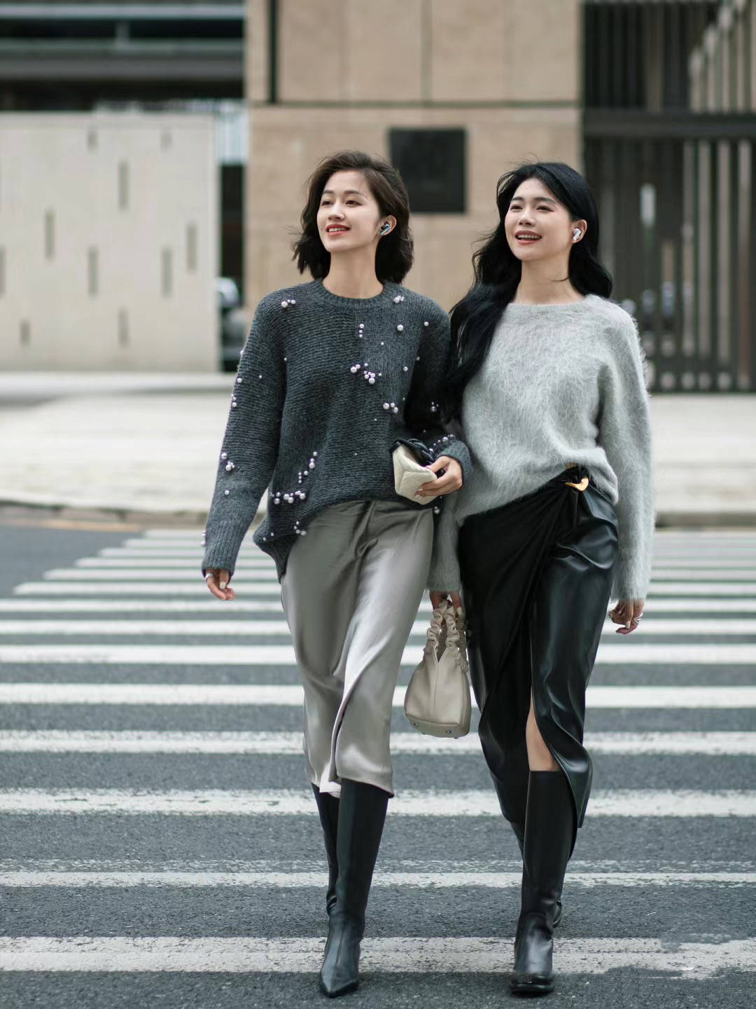 就像是简单慵懒的毛衣,宽松的版型穿起来也是舒适大方的。可以搭配个性细腻且带有一定轻盈感的缎面半身裙,这种视觉上的撞击感呈现出更时髦的造型。