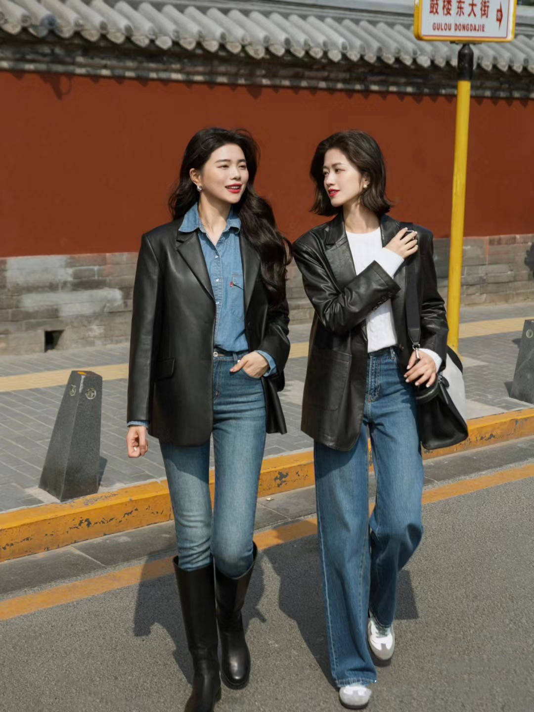 黑色西装款式的皮衣外套,可以搭配高腰的直筒牛仔裤,也可以搭配修身的高腰牛仔裤。想要更清爽拉风的美,就选择白色T恤作为内搭,想要复古精致的美,可以用牛仔衬衫作为内搭。