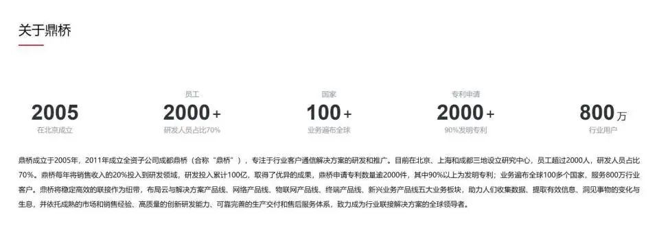 目前,鼎桥通信为TD TECH实际经营主体,专注于行业客户通信解决方案的研发和推广,在北京、上海和成都三地设立研究中心,员工超过2000人,研发人员占比70%,鼎桥每年将销售收入的20%投入到研发领域,研发投入累计100亿,申请专利数量逾2000件,其中90%以上为发明专利,业务遍布全球100多个国家,服务500万行业客户。