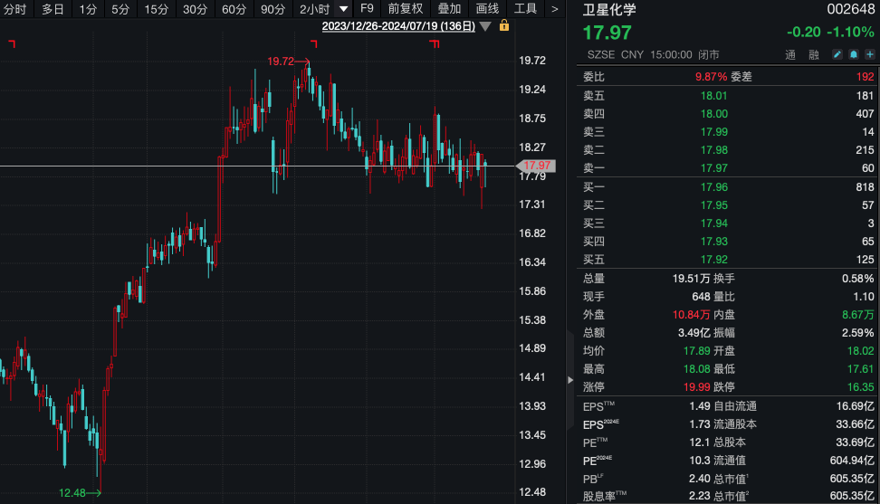 截至目前,卫星化学最新股价为17.97元/股,总市值约为605亿元。