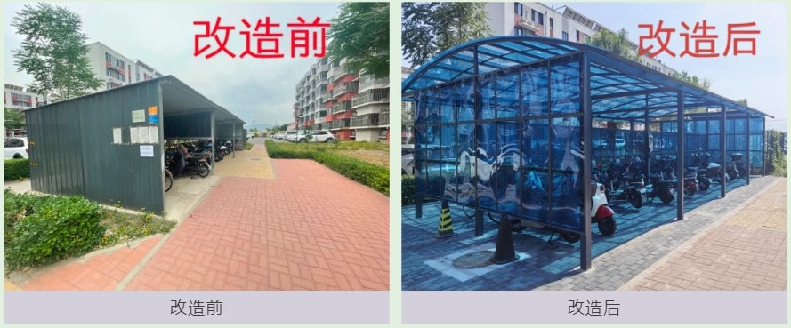 随后,为彻底治理乱停放的自行车、电动车,社区新建造了6个自行车棚、扩建改造了2个充电桩自行车棚,满足了居民电动车充电的需求,消除了室内、飞线充电的安全隐患。