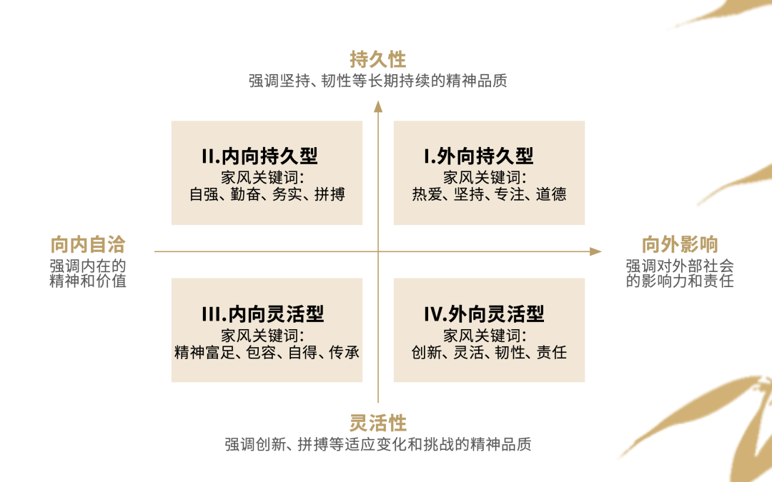 《报告》指出,多维发展、社会责任、精神富足、创新变革和文化自信等关键词与现代家风传承密切相关。在共性的基础上,当代家风在不同的家庭中呈现出丰富多彩的个性特征,展现出“家文化”的多元性和适应性。为深入探讨这种多样性,《报告》依据核心价值取向构建了双维模型——“持久性vs灵活性”与“向内自洽vs向外影响”,将家风传承中的典型家族划分为四种类型(外向持久型、外向灵活型、内向持久型、内向灵活型)。这不仅为观察中国家风传承提供了结构化视角,也为更多现代家庭审视自身文化特质、设定传承重心提供了参照。《报告》撰写小组成员举例,“外向持久型”的代表梁启超家族,强调爱国、进取和责任,尊重后代多元发展,聚焦于对社会产生积极影响与成就突破。