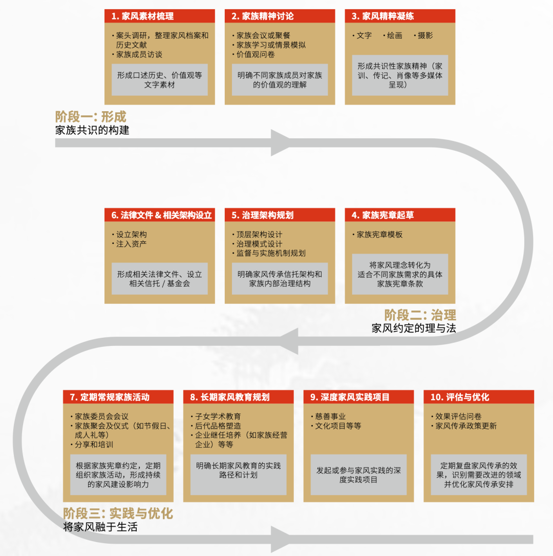 为解决家风传承难题,《报告》系统性地提出“家风传承方法论”,设计了“形成—治理—实践与优化”的实施路径,并细分家风梳理、家族治理、家风实践与优化等十大步骤,形成兼顾标准化与个性化的落地方案。