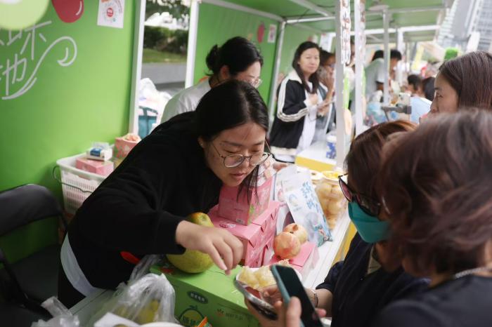 9月19日,在北京西城金融街“邮味集市”上,邮政工作人员在摊位上向消费者推介农产品。