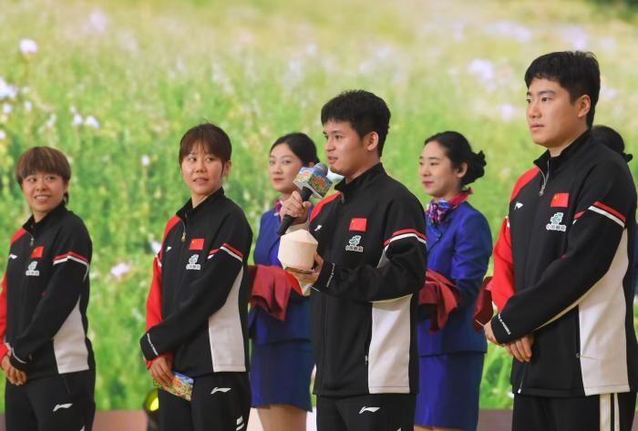 乒乓球世界冠军林诗栋在启动仪式上推荐家乡特产。