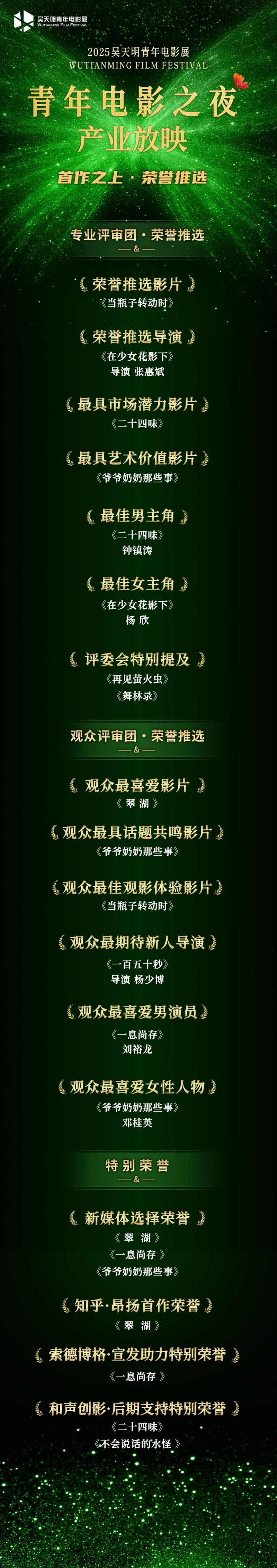 获得本届青年电影展“首作之上·荣誉推选”的分别是:电影《二十四味》获得“最具市场潜力影片”奖,《爷爷奶奶那些事》获得最具艺术价值影片,知名资深营销专家荣超;著名摄影指导、导演、监制王昱担任颁奖嘉宾;电影《二十四味》王永堂的扮演者钟镇涛获得“荣誉推选男演员”,电影《在少女花影下》西里的扮演者杨欣获得“荣誉推选女演员”,中国著名演员潘斌龙、中国著名演员迟蓬担任颁奖嘉宾;电影《在少女花影下》导演张惠斌获得“荣誉推选导演”,2025吴天明青年电影展终审评委、导演、上海电影家协会会长郑大圣担任颁奖嘉宾;电影《当瓶子转动时》获得“荣誉推选影片”,吴天明青年电影展组委会荣誉主席、评委会主席、著名电影人焦雄屏担任颁奖嘉宾;电影《再见萤火虫》《舞林录》获得“评委会特别提及”,中国著名制片人、演员、出品人梁静担任颁奖嘉宾。