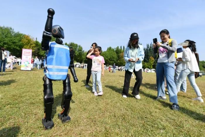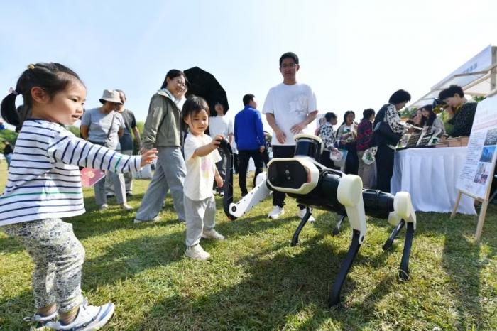大小朋友与现场的机器人互动。