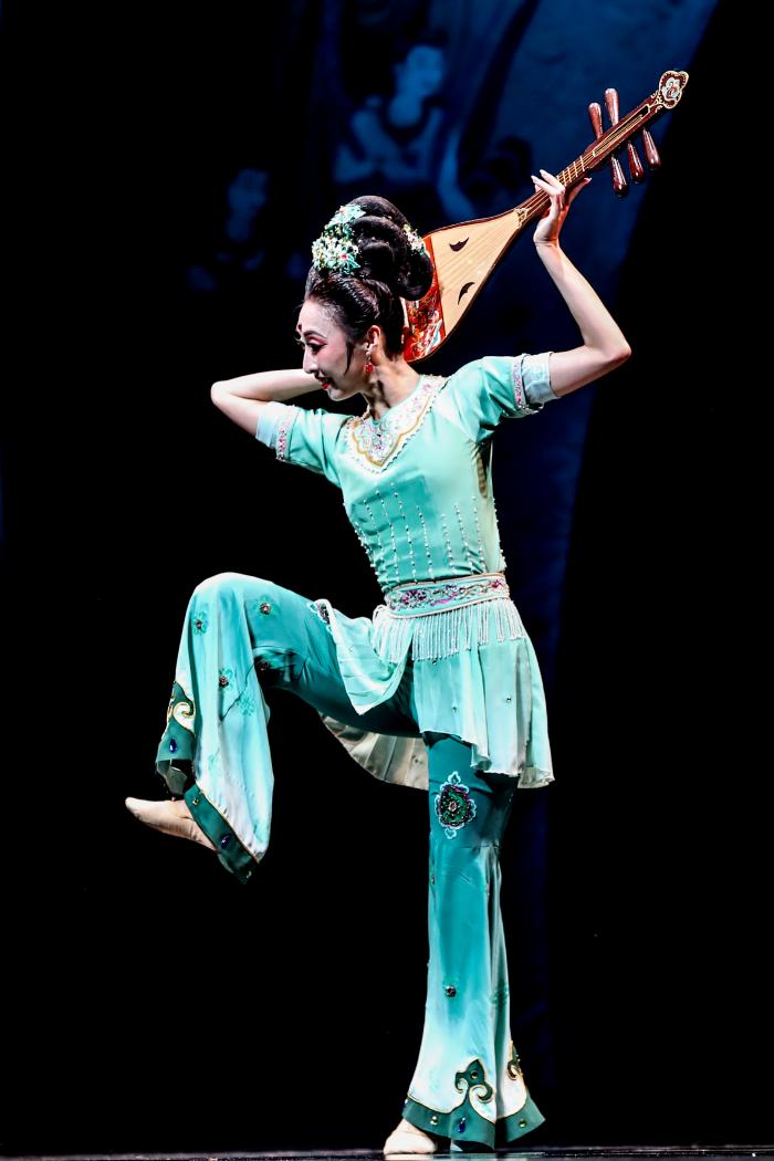 9月20日晚,演员在敦煌大剧院表演新版《丝路花雨》,展示经典舞姿“反弹琵琶”。