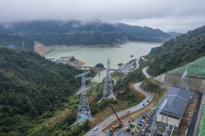 9月23日拍摄的浙江天台抽水蓄能电站的开关站(右下)、输电铁塔以及下水库(无人机照片)。浙江天台抽水蓄能电站是国家“十四五”重点实施项目、浙江省“十四五”期间规划的重大建设项目,总装机容量170万千瓦、单机容量42.5万千瓦,计划于2025年底实现首台机组投产目标。全部机组投产发电后,每年可输送清洁电力约17亿千瓦时,将显著提升浙江电网的调峰能力和运行可靠性。新华社记者 徐昱 摄
