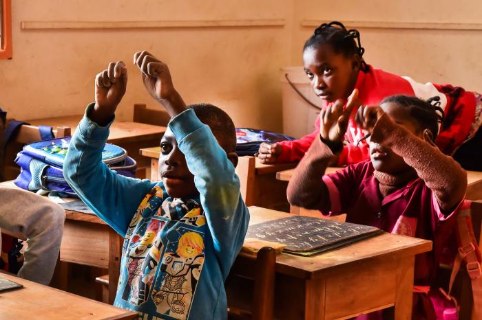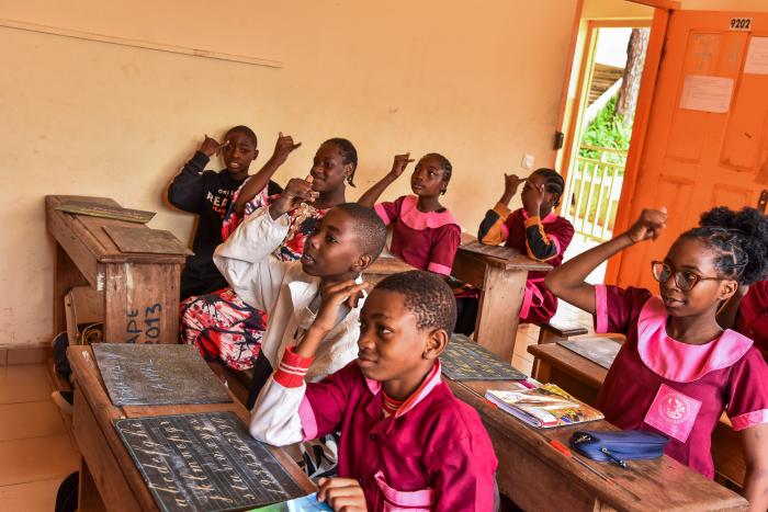 9月22日,学生们在喀麦隆首都雅温得的一所听障儿童特殊学校上手语课。新华社发(科普索摄)