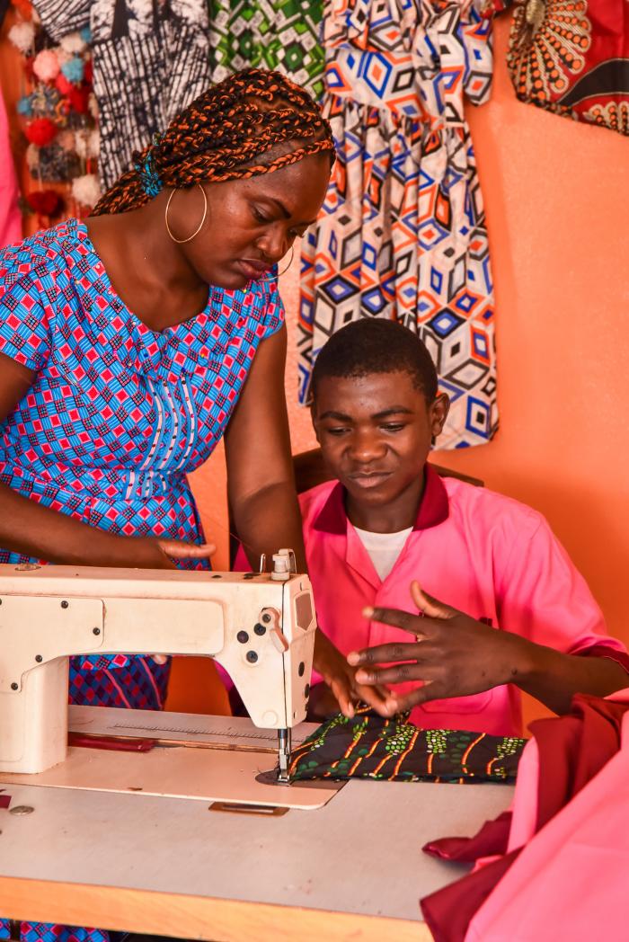 9月22日,在喀麦隆首都雅温得的一所听障儿童特殊学校的手工艺中心,一名培训师在教学生缝纫。新华社发(科普索摄)