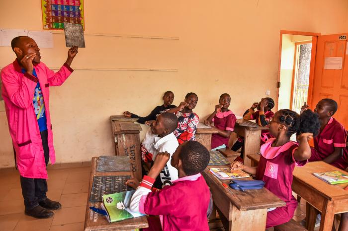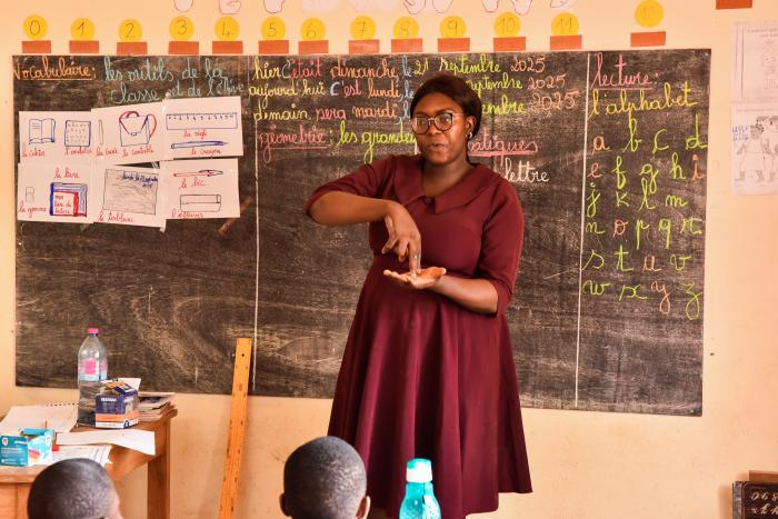 9月22日,在喀麦隆首都雅温得的一所听障儿童特殊学校,一名教师给学生上手语课。新华社发(科普索摄)