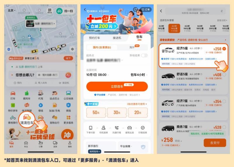 “十一”期间,滴滴包车还推出多重优惠活动。9月25日前,用户通过滴滴App或小程序进入滴滴包车十一活动页,即可领取20元无门槛立减券,每日还可抢立减200元包车券,邀请好友助力额外获得100元券(满400元可用);9月26日至10月8日期间,用户可参与抽奖活动,赢取5折券、千元立减券,参与答题可得最高100元券(满400元可用)。先领券再包车,出行更优惠。