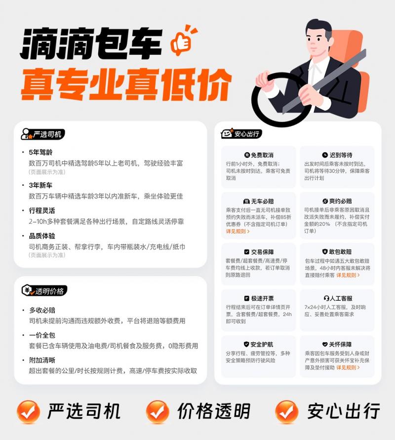 为了给用户提供用户安全、可靠的服务,滴滴包车严选3年内准新车、5年以上驾龄且服务好的专业司机,并在行程前、中、后全程提供多重服务保障。所有计费规则公开、清晰、透明,对于超时长费、超公里费也在App里明确标注,杜绝隐形费用。所有行程中也无隐形消费,出行更放心。