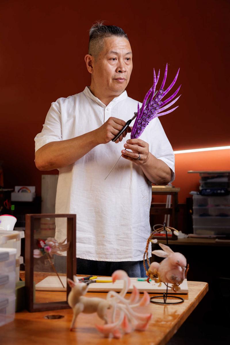 近日,新京报记者来到位于通州区宋庄艺术园区的绒花制作工作室时,蔡志伟正俯身于工作台前,灵巧的双手在整理一个用紫色绒条组装成的凤凰尾羽,最长的一根绒条长30余厘米——那是他耗时三个月,为参加明年中国工艺美术博览会精心打造的《鸾凤和鸣》头饰的核心部件。蚕丝细密如雾,在他手中却驯顺地缠绕于铜丝之上,仿佛被赋予了生命。