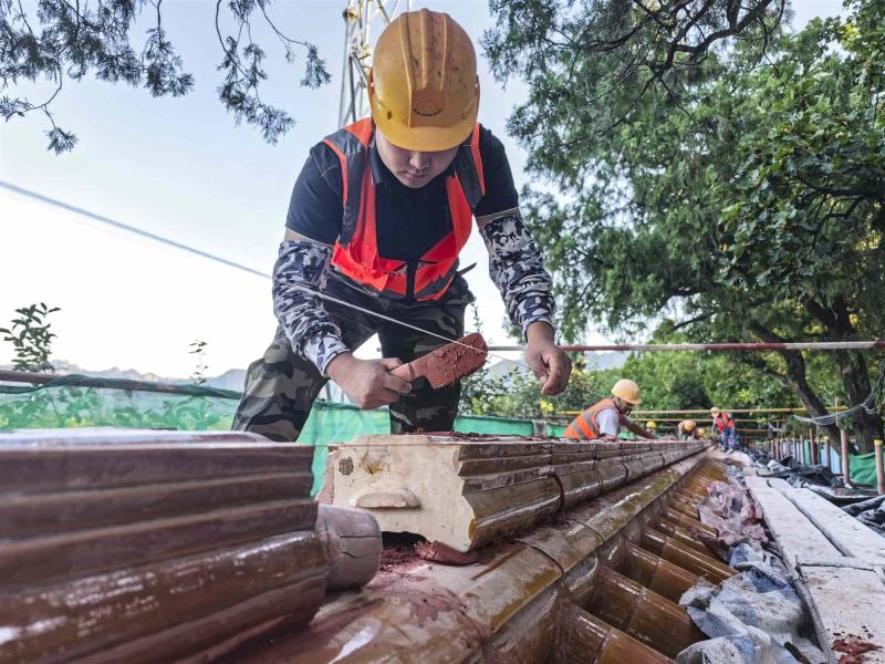 时间辗转近一个世纪,这次琉璃瓦的形制是按照明永乐时期瓦片形状尺寸,研判多次确定的,当下修缮的关键则完全取决于修复师的手艺和技巧。拴线、捏当沟、下压当条……琉璃屋面挑正脊需要经过约十道工序,这是精细活,得下慢功夫。伊文龙俯身操作,瓦刀将麻刀灰利落地敷入琉璃瓦边缘,起刀干净,灰瓦分明。从瓦垄上牵出的细线,无声地检视着工匠的手艺——“一片瓦看不出来,但当整个屋脊的瓦连成一片,这条线就能清晰勾勒出平整度的差异。”有的师傅手稳眼准,每片瓦紧贴基准线;也有人手下参差,误差能达到几毫米。