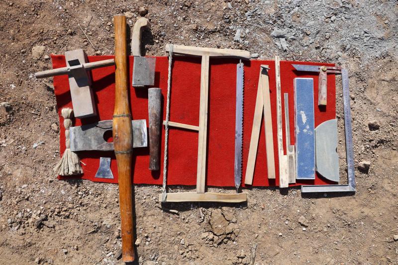 伊文龙的工具。中间的“砖锯”是他研发的,形似木锯,但专用于泥瓦作,大大提升了效率。新京报记者 浦峰 摄