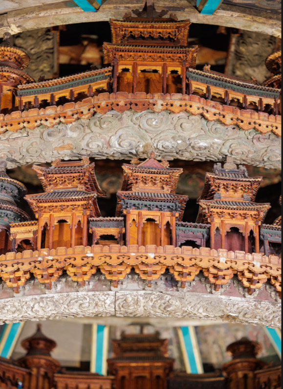 这是个上下六层的藻井,外圆内方,最上方是一幅华美星象图,下方是多层托在云纹上的亭台楼阁,有各式长廊贯通,榫卯拼接,斗拱相扣,建筑内均有神像放置,底层有四大力士托举,“无处不雕刻,无层不精彩”,真正的“琼楼玉宇,何似在人间”。现在博物馆预约观赏,每天放号上千个仍供不应求。