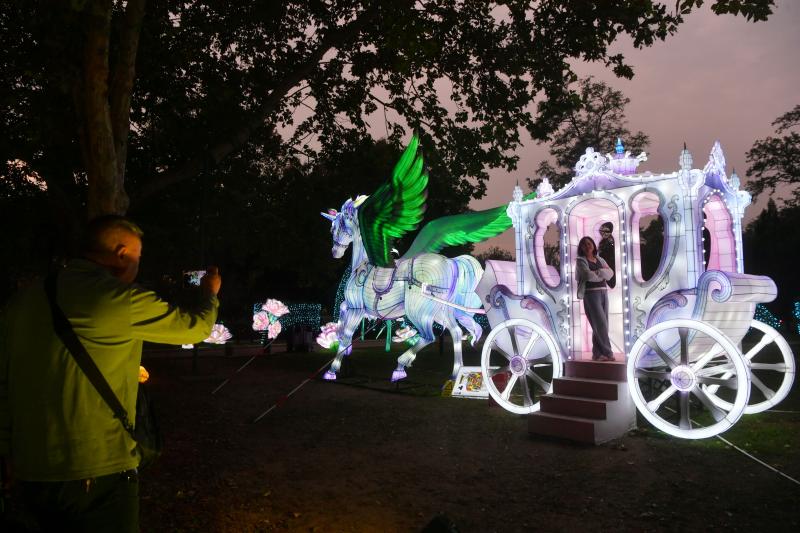 入口处的“中国国宝”主题熊猫花灯最为吸睛。头戴花环、手捧竹笋的熊猫憨萌可爱,吸引了不少小朋友的驻足,“孩子一进来就不肯挪地儿了,实在是太可爱了!”一位带着五岁孩子来逛灯会的宝妈笑着说。一路前行,欧洲区、美洲区、非洲区等不同主题区域,在灯光映衬下如梦似幻,展现出了别样的异域风情。
