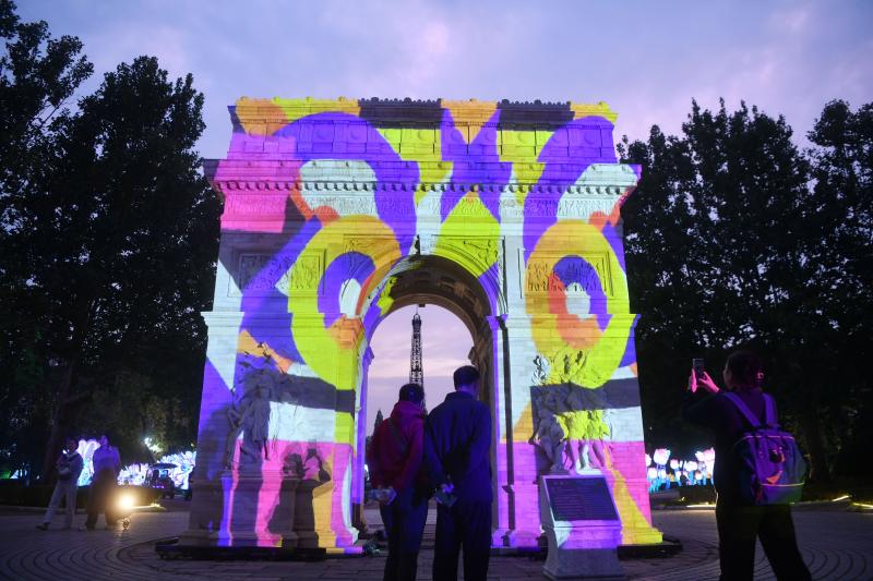 本次灯会以“京彩世界奇妙夜”为主题,依托世界公园特色微缩景观,设计狂欢之夜、浪漫欧洲、活力美洲、激情非洲、神秘亚洲、多彩大洋洲及“一带一路”七大主题展区。园区内,来自自贡的非遗彩灯技艺搭载世界五大洲文明,带给游客穿越世界的沉浸式体验。“埃菲尔铁塔”处,一场时尚灯光秀正在上演,不断变幻的色彩将铁塔装扮得绚烂夺目。“凯旋门”处闪烁的是童话乐园主题彩灯,身着古装的演员随着音乐为观众带来了一场独舞表演。不远处,非遗打铁花大秀开始了,绚丽的铁花在空中迸发出璀璨的光芒,照亮了每个游人的脸庞。
