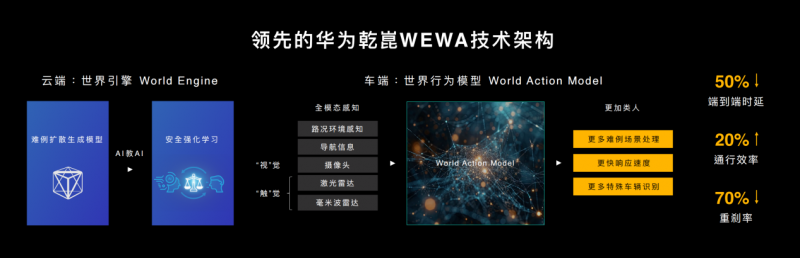 我们有必要先来解析一番尚界H5所搭载的华为乾崑智驾ADS 4。其采用全新的WEWA架构,由云端的世界引擎和车端的世界行为模型组成,实现了以“AI训练AI”的方式解决行业普遍存在的长尾难题,例如鬼探头、前车急刹等。同时相比上一代架构,系统延时更低,响应更快,变道更丝滑,无效变道次数减少,重刹率显著降低。