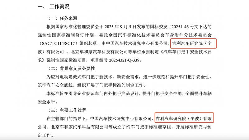 9月24日,工信部官网公开征求《汽车车门把手安全技术要求》强制性国家标准社会各界意见,旨在应对电动隐藏式车门把手新技术、新安全需求,进一步规范和提升车门把手安全性,筑牢汽车安全底线。在主管部门的指导下,吉利作为车企联合牵头单位开展了相关标准研究与制定工作。