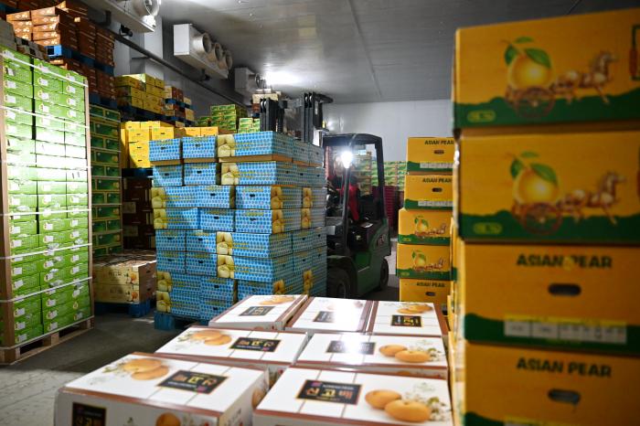泊头市素有“中国鸭梨之乡”的美誉,鲜梨种植面积达25万亩,产品远销30多个国家和地区。9月23日,泊头东方果品有限公司工人驾驶叉车在冷库内运输鲜梨。