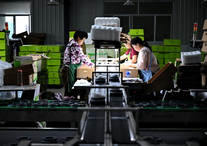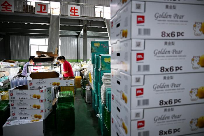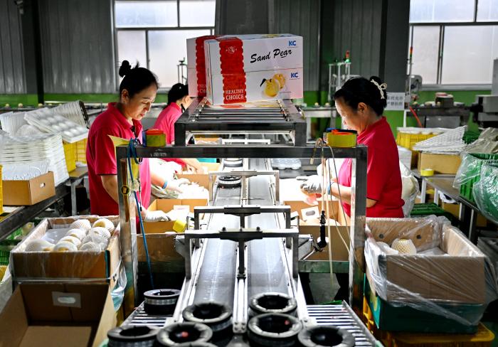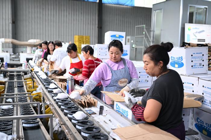 9月23日,泊头东方果品有限公司工人在包装鲜梨。