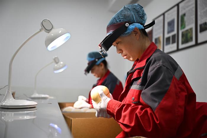 9月23日,泊头东方果品有限公司质检人员在检验出口鲜梨。